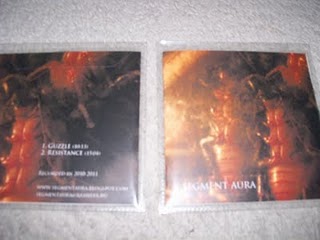 The second & last track is entitled “Resistance” and comes in at 15.04 mark. And this track is buit around juddering, lo-fi and semi rymic reeling or spooling static textures. The ‘wall’ brings to mind an erratic & semi overload electronic type writer or telelex machine shorting and reeling away. There are no great shifts or alterations in the track sound map, but from time to time off patterns are fed into the mix or sudden layer of the wall is stripped out. All told it’s a great track & it really churns you head in a great lo-fi yet brutally manner.